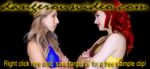 DC 4 54 - KAT VS ANGELICA CHAMPIONSHIP MATCH!And now your main event! Just in time before their trip to Korea, its the tournament finals rematch everyone has been waiting for, Angelica especially since she's been absolutely humiliating her opponents so she finally gets another crack at our long-time champ Kat who is more than happy to put the other redhead away for good, claiming that if she beats Angelica again, she's never getting another title shot! Both mean, loud, and vicious, little time is wasted being courteous to each other but a lot goes by before one is forced to submit or gets pinned! They just don't want to give the other the satisfaction! Every bit as spiteful, intense, and energetic as you thought it would be, Kat absolutely sees Angelica as her biggest rival currently and acts accordingly, immediately going on her worst behavior after getting sick of Angelica's complaining and accusations of cheating! The punches, elbows, and hair pulling make it abundantly clear the hatred they have for each other and the high stakes on the line, as if all the body scissors, choking, stretch-out pins, guillotines, head scissors, sleepers, camel clutches, and more weren't enough of a clue! If it wasn't obvious already, they'd rather die first then tell the other they submit to them or be pressed body to body for a ten count! No, there is a clear and decisive knockout victory and oh my God they winner is at her bitchy best! And instant classic!